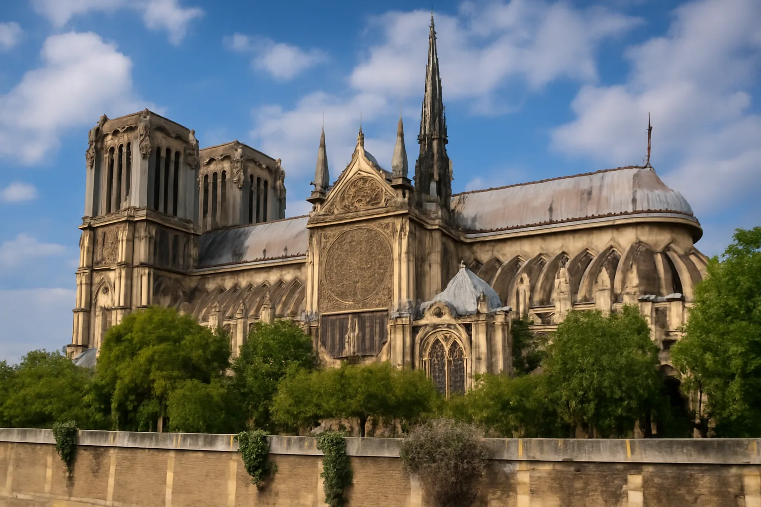 From the Seine banks, the cathedral looks both familiar and subtly different. The scaffold that hid the heart of the building for years has largely been cleared. The spire — rebuilt to match the original by Eugène Viollet-le-Duc — rises again. Walk along the quai and you’ll feel the same skyline that generations of Parisians have known. Yet there is a newness in the stonework and the crispness of the rooflines. That precision is the result of painstaking craft: masons and carpenters matched age-old techniques with modern materials when needed.